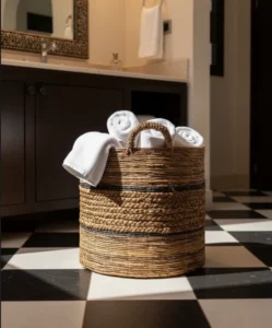 Paniers à linge tressés à la main, robustes et aérés, conçus pour un usage quotidien élégant. Parfaits pour suites, salles de bain et espaces bien-être.